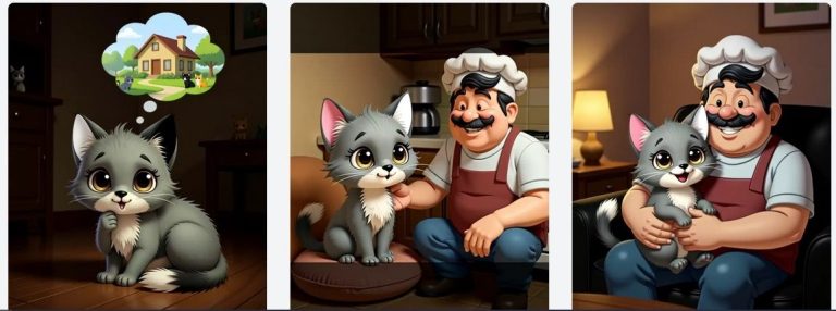 Also stellte sich die Frage: Wie bekommen wir schöne, ansprechende Illustrationen für die Bücher, ohne dass wir in ein Zelt umziehen müssen? Die Antwort war schnell gefunden: Wir versuchen es einfach mit Bildern, die von KI erstellt werden. Das Ergebnis war erschütternd. Auch wenn die KI heutzutage sehr lebensechte Bilder und Filme erstellen kann, sieht die Sache, wenn es um Cartoons geht, noch anders aus. Weiter unten findet ihr ein paar Beispiele, was die KI aus den Ideen für Flauschi und Luigi „kreierte“.